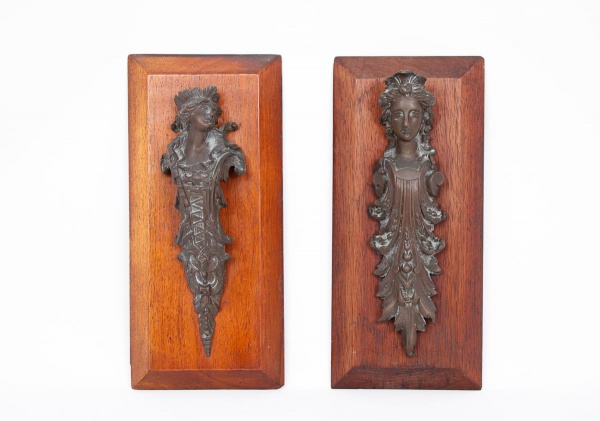 • Lote constando de duas antigas guarnições de móveis franceses em bronze patinado ricamente cinzeladas representando " figuras femininas " fixadas em molduras de madeira guarnições - med. 25x8 cm e com moldura - med. 32x15 cm e med. 26x8 cm e com moldura - med. 32x15 cm