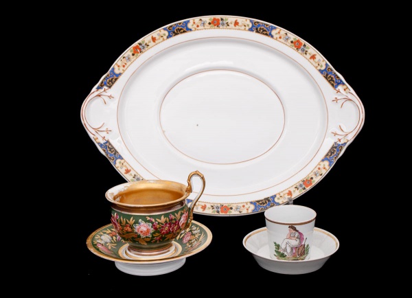 • Lote constando de três antigas peças diversas em porcelana sendo uma travessa em porcelana portuguesa da manufatura " Vista Alegre ", borda decorada com flores e folhagens policromadas, marca da manufatura na base - med. 4x43x31 cm, uma xícara de chá com pires para chocolate em porcelana ricamente policromada com flores e folhagens, bordas, frisos e alça com pátina a folha de ouro, xícara possivelmente francesa - med. 12x17 cm de diâmetro (pires com quebrado e colado na borda e desgastes na folha de ouro), e rara xícara de café com pires em porcelana europeia policromada do século XIX, decorada com figuras femininas, marca da manufatura na base, xícara - med. 6x9 cm de diâmetro e pires - med. 3x12 cm de diâmetro - xícaras para coleção