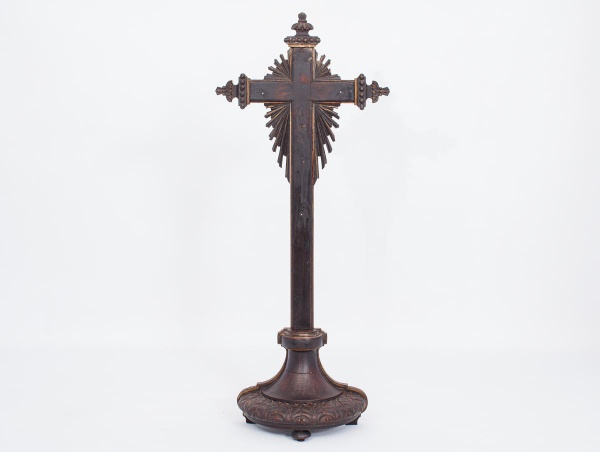 • Antigo crucifixo de mesa em madeira nobre ricamente entalhado, base apoiada sobre três pés - med. 66x22x12 cm (falta o cristo)