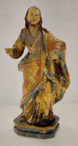 • São José - antiga imagem sacra Brasileira cerca de 1900 em madeira entalhada e policromada com realces a folha de ouro, olhos de vidro - med. 25x10x8 cm (com desgastes na policromia)