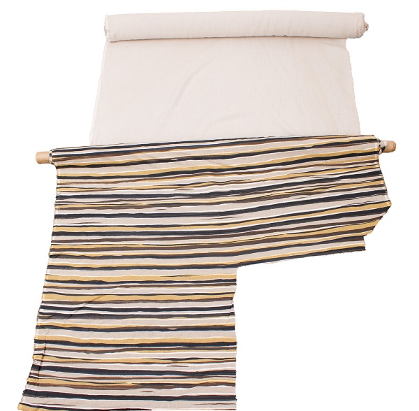 • Lote constando de dois rolos de tecidos incertados sendo um com o tecido no tom bege e outro em tecido listrado em tons de bege, preto, marrom, branco