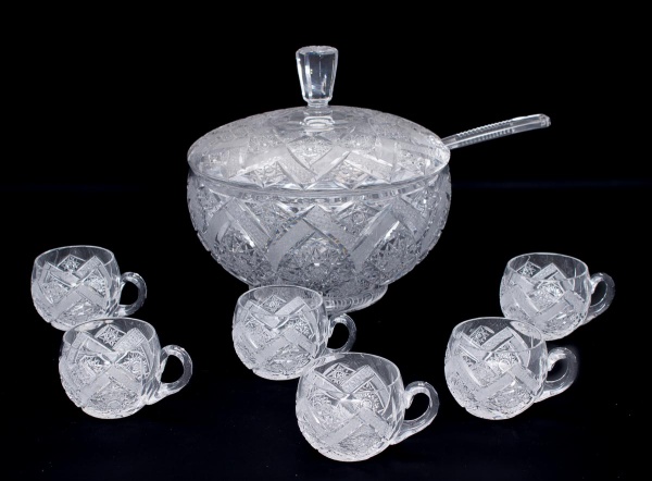 • Antiga poncheira em cristal da Bohemia ricamente lapidada com estrelas, frisos bisotados constando de uma poncheira - med. 27x28 cm de diâmetro (com dois bicados na borda), acompanha seis canecas - med. 8x8 cm de diâmetro (quatro com bicados na borda) e uma concha med. 35 cm - Total de 8 peças