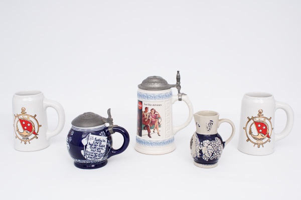• Lote constando de 4 canecas e uma pequena jarra diversas, sendo uma Alemã decorada com propagandas da "Coca-Cola" policromadas, tampa em metal, com inscrições na base e data de 1994, med. 20x13x10 cm de diâmetro na base. uma Alemã com tampa em estanho decorada com rosto de frade, em porcelana na cor azul e branca decorada com músicos, dançarinos e inscrições na lateral da manufatura "Seidel" med. 13,5x14x8 cm de diâmetro, par de canecas em porcelana branca com o logotipo policromado com âncora e Timão da Reserva Especial da Estrella Galícia - 1906, med. 14,5x13x9 cm de diâmetro na base e uma pequena jarra em cerâmica Alemã policromada, bojo na cor azul cobalto decorada com cachos de uvas e folhas de parreira med. 12x9x5 cm de diâmetro.
