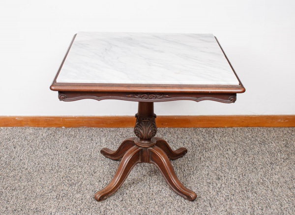 • Antiga mesa auxiliar com tampo quadrado em mármore branco rajado, saia recortada e entalhada, coluna central torneada e entalhada apoiada sobre quatro pés curvos med. 60x70x70 cm (tampo com bicado em uma lateral).