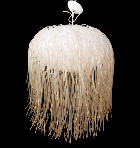 • Fernando Jaeger - Lustre da década de 90 estilo contemporâneo na cor branco para uma lâmpada, cúpula em plástico rígido com diversos tubos em plástico translúcido, acabamento superior da cúpula e do teto em metal com pátina branca - med. 100x60 cm - Fernando Jaeger é um designer de móveis Brasileiro (metal e espelho com pequenos desgastes de maresia e os dois espelhos do teto com pequenos amassados), parte elétrica funcionando