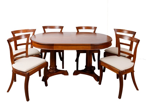 • Elegante conjunto de mesa com seis cadeiras estilo Inglês em madeira nobre, mesa com tampo oval apoiada sobre duas colunas torneadas, bases com pés entalhados na forma de "garras" med. 79x160x100 cm, cadeiras com encostos curvos vazados com uma trave central, assentos em palhinha Indiana, pernas curvas med. 86x50x44 cm (acompanha almofadas para os assentos em tecido bege). Tecidos com desgastes de uso e cadeiras com pequenos desgastes no verniz).