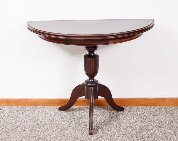 • Mesa console em madeira nobre, tampo na forma de meia lua reversível para mesa de jantar redonda, coluna central torneada e frisada, apoiada sobre três pés curvos med. 78x107x53 cm (fechada) e 78x107x106 cm de diâmetro (com pequenos defeitos na placagem da folha do tampo).