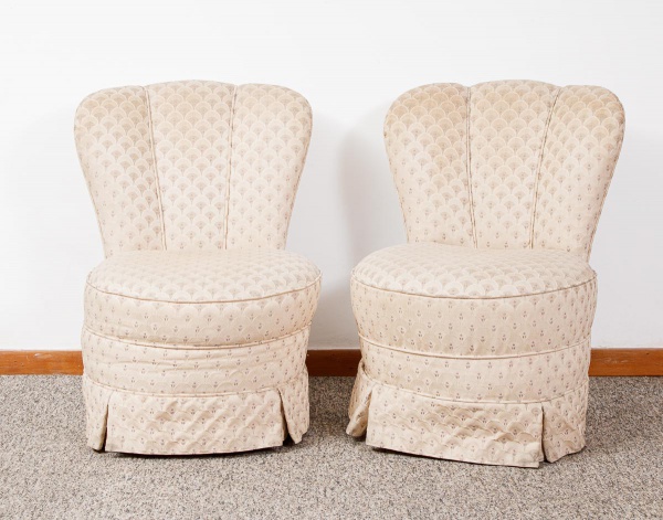 • Antigo par de poltronas ditas "bonecas" com encostos e assentos estofados em tecido bege, encosto curvo, med. 79x55x55 cm (tecidos com desgastes de uso e do tempo e uma com pequeno defeito no tecido das costas).