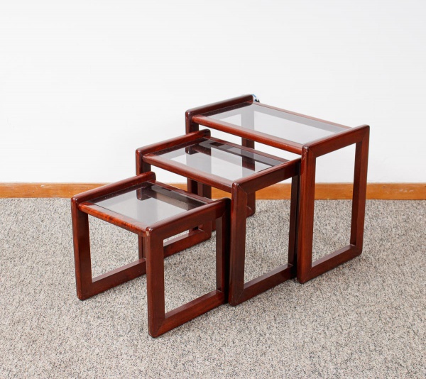 • Mesa auxiliar dita "três Marias" da década de 80 em madeira envernizada, tampos retangulares em vidro fumê, pernas retas com traves nas laterais das bases med. 50x58x35 cm (a maior), 43x47x34 cm e 36x37x32 cm (a menor) com pequenos desgastes no verniz).