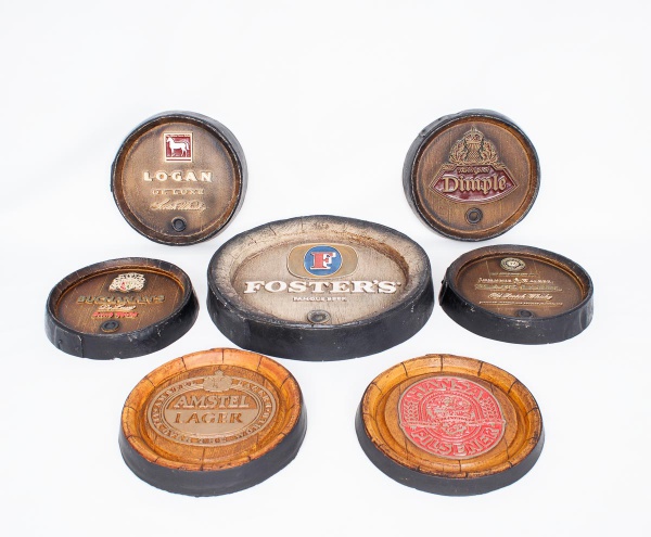 • Lote constando de sete placas redondas de parede decorativas, sendo cinco em ficha de vidro e duas em papel marchê policromadas, decoradas com marcas de Whisky e de cervejas policromadas med. 4x26 cm (a menor) e 6x38 cm de diâmetro (a maior). Uma placa com pequeno defeito na borda).